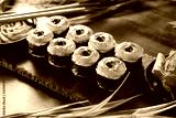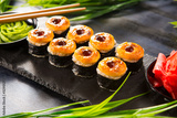 Set of baked sushi rolls with wasabi and ginger on a black background. Japanese oriental cuisine