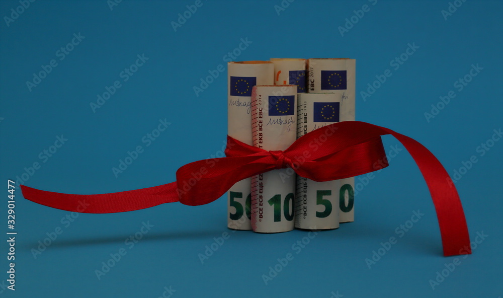 Banknotes of euro currency rolled in rolls, tied with decorative red ribbon, bow isolated on blue background, concept of economical / financial gift / present