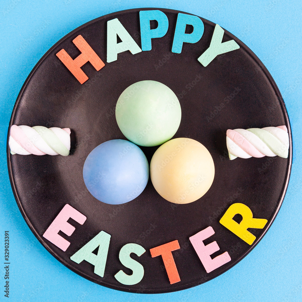 Happy Easter text with colorful eggs and marshmallows arranged on black plate - top view and square format