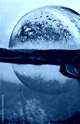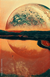 Fantasy landscape of lonely boat sailing across scenic lake on alien planet. Book cover design digital illustration. Elements of this image furnished by NASA