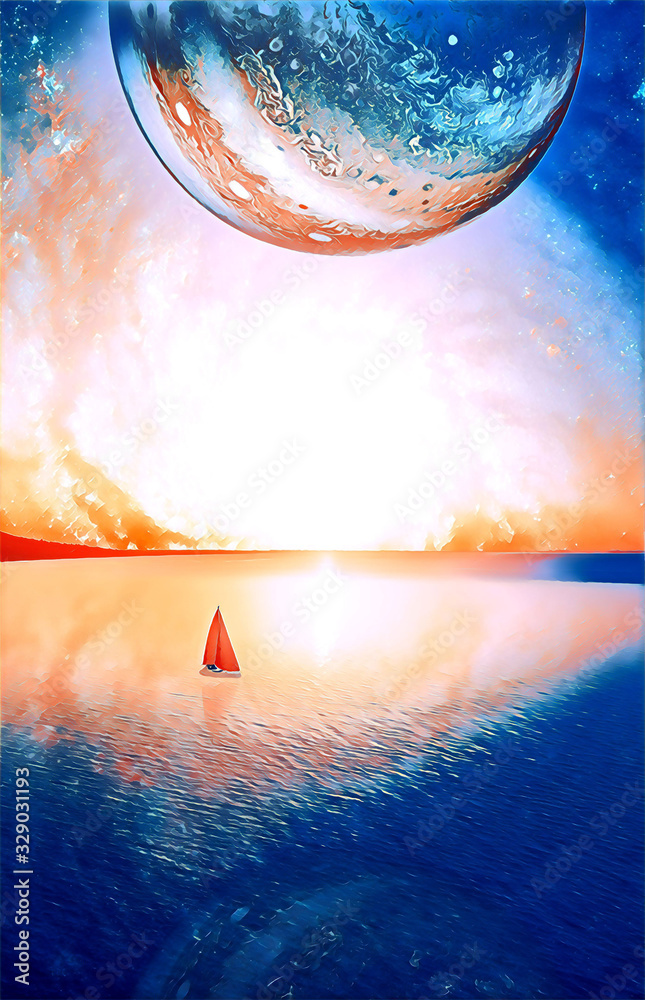 Dreamy fantasy landscape of lone sailboat sailing at sunset near coastline. Book cover template digital illustration. Elements of this image furnished by NASA