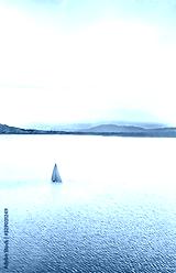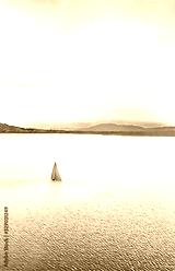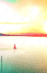 Minimalist fiction book cover design with copy space. Unreal sunset over lake and sailboat on alien planet digital illustration. Elements of this image furnished by NASA
