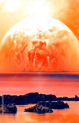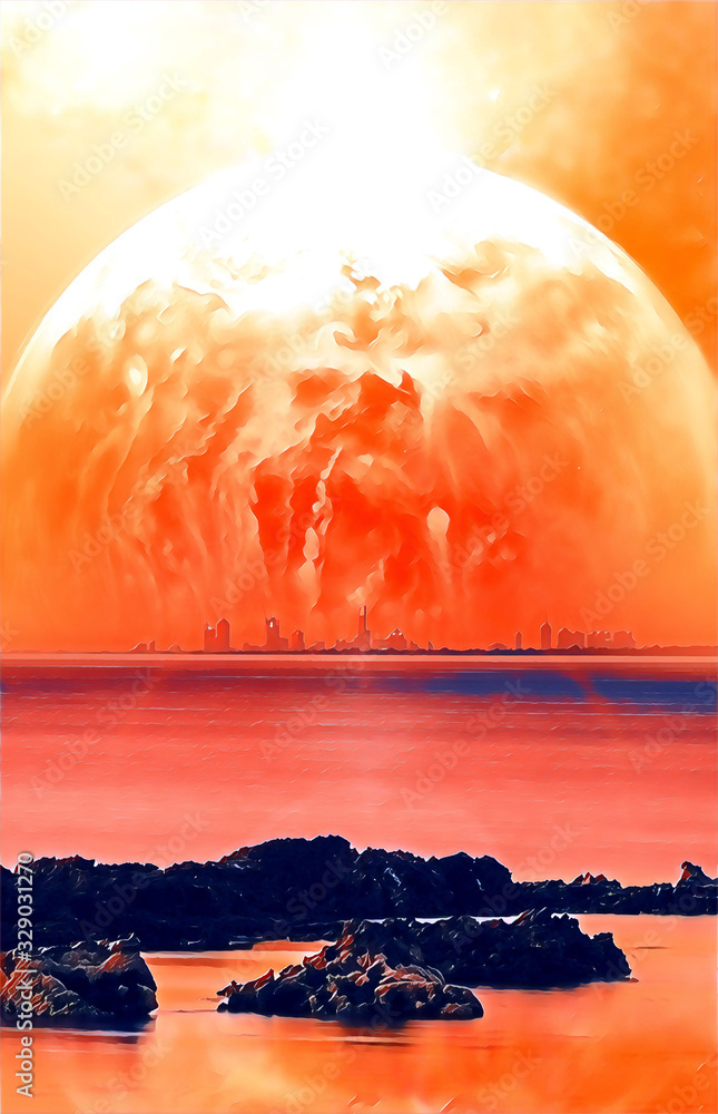 Science fiction book cover template - fantasy landscape of modern city skyline with rocks on the foreground and alien planet digital illustration. Elements of this image are furnished by NASA