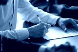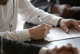 Close up young male employee manager customer hands signing paper contract after checking. Millennial investor client put signature at business agreement between partners. Editor making corrections.