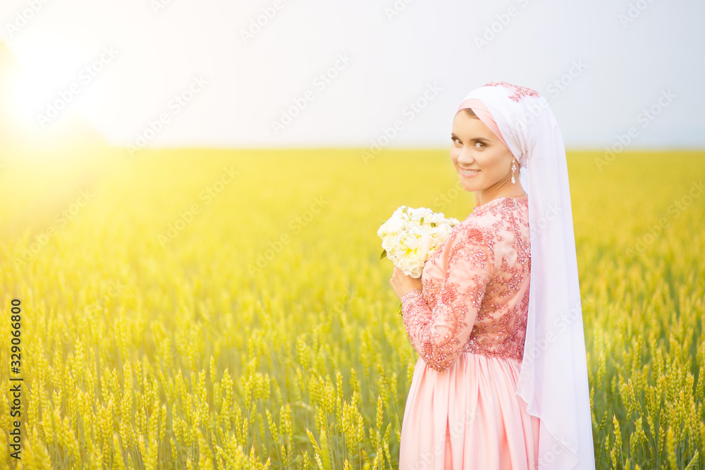 Beautiful young oriental bride preparing for wedding. Muslim marriage