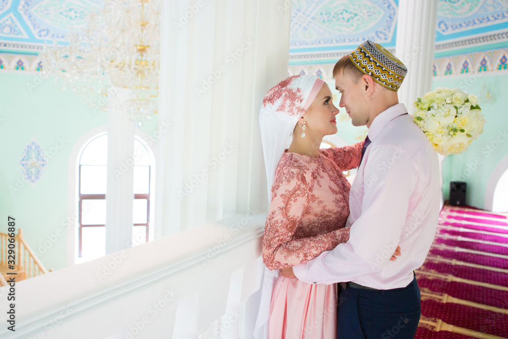 Islamic couple in a mosque on a wedding ceremony. Muslim marriage