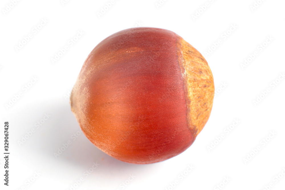 One dried hazelnut in closeup isolated on rhe white background