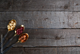 mixed nuts in metal spoon on wooden table.