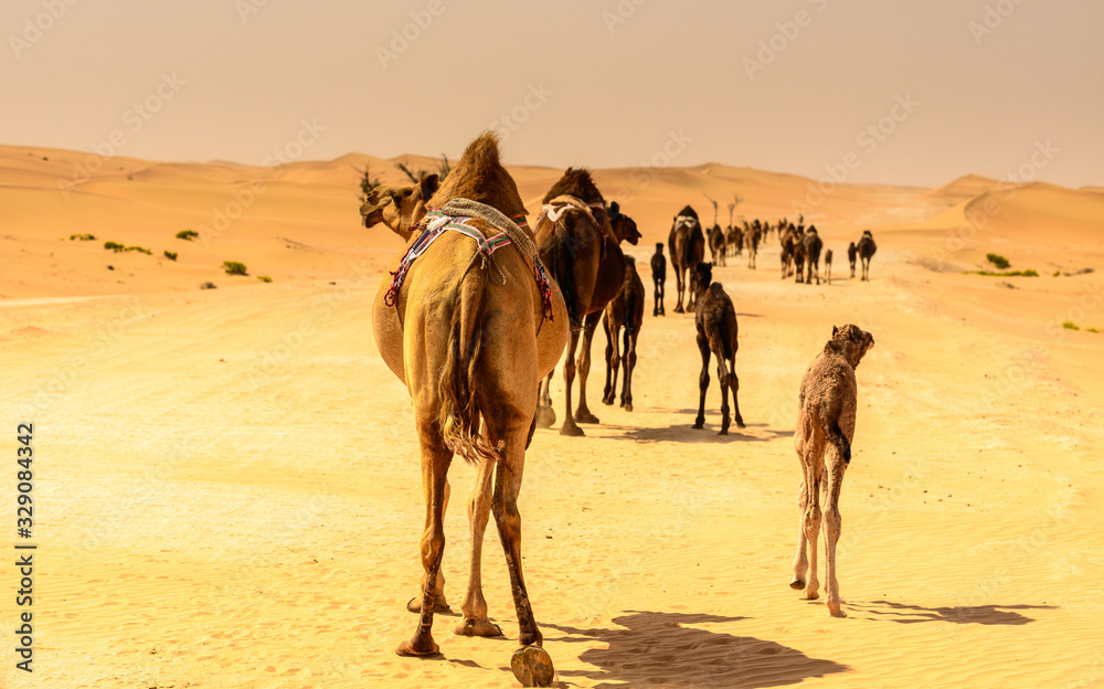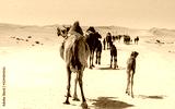 a caravan of camels making their way through the desert, naturally and instinctually navigating through the dunes