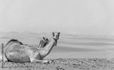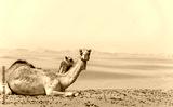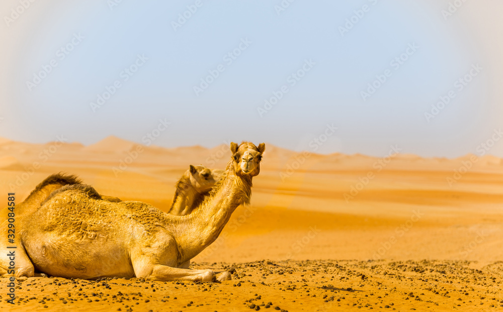 two big camels in the desert relaxing in heat of the sun in the background you can see sand dunes