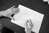 High angle close-up view of a senior Caucasian woman's hands drawing Alzheimer's disease cognitive functions clock test with positive results suggesting illness