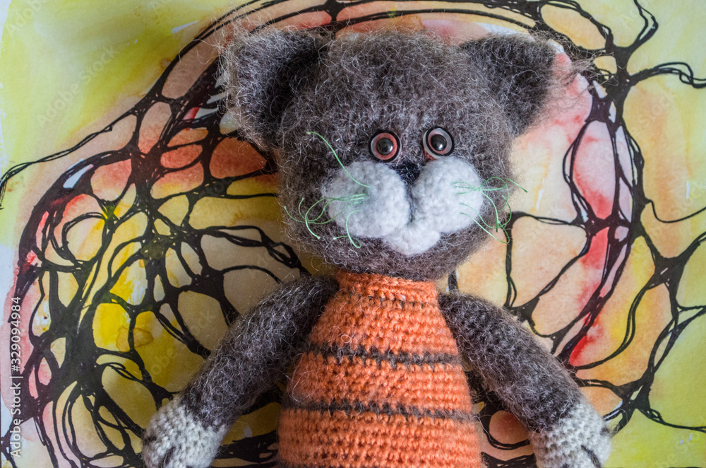 Knitted gray cat in orange clothes on a picturesque background.