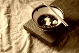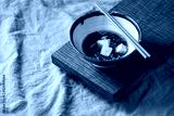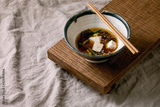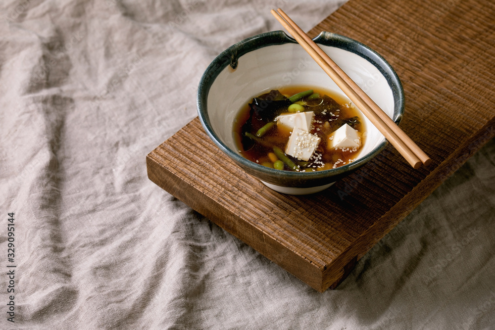 Japanese Miso broth soup with silk tofu cubes, soy beans edamame, green beans in traditional bowl with chopsticks on wooden japanese table on grey linen table cloth. Asian dinner.
