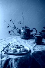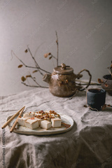 Silk tofu japanese soy cheese sliced cubes with chili ginger, chive and soy sauce topping on ceramic plate with chopsticks, ceramic teapot and cups on grey linen table cloth. Asian dinner.