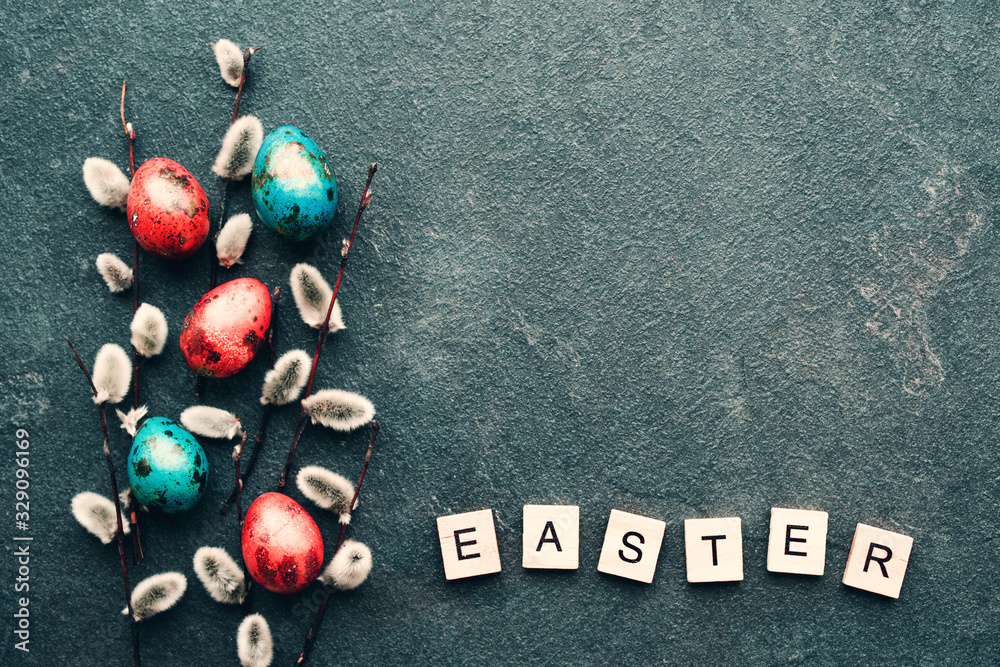 Bright red and blue easter quail eggs and fluffy willow branches, text EASTER made from wooden letters on a black background, top view. Easter background.