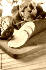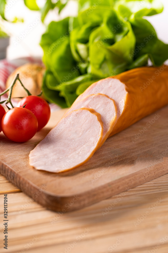 Poultry Krakowska smoked sausage. Chicken cold cuts. Poultry cold cuts on wooden cutting board.