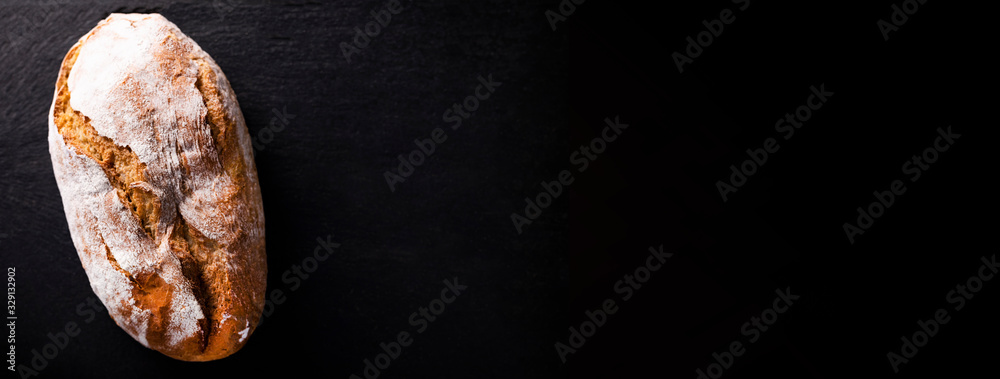 Loaf of handmade country bread on a black background. Breadstuff. Wide, top view, with copyscape.