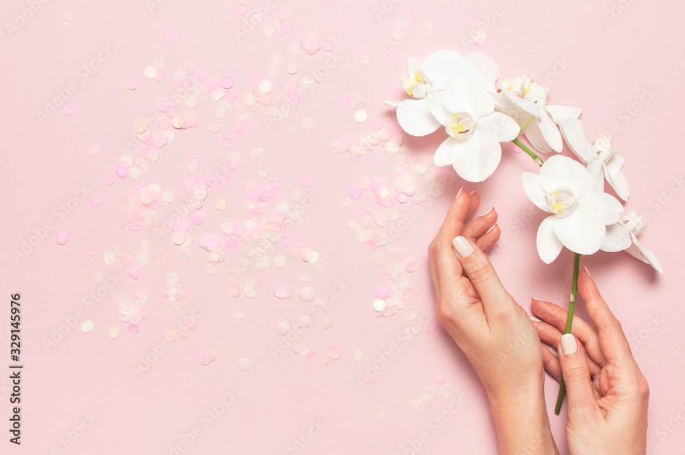 Woman's hands with gentle manicure hold branch of White Phalaenopsis orchid flowers on pastel pink background with festive confetti top view flat lay. Tropical flower. Holiday Women's Day Flower Card