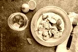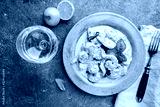 Shrimps in cream sauce with Coconut milk on a plate, top view or view from above, flat lay