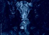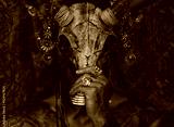 Tattooed masked skull ethnic pagan shaman sit on stage an ancient temple.