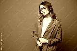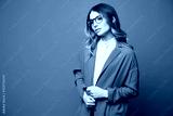 Beautiful young woman in round glasses, beige blouse and trendy blue coat isolated at blue background. Model girl in blouse, blue coat and modish eyewear over blue background. Copy space. Spring look