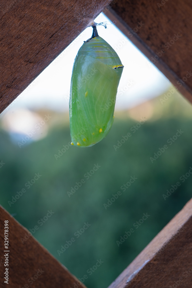 Monarch Butterfly Chrysalis Hanging on Wooden Deck Vertical