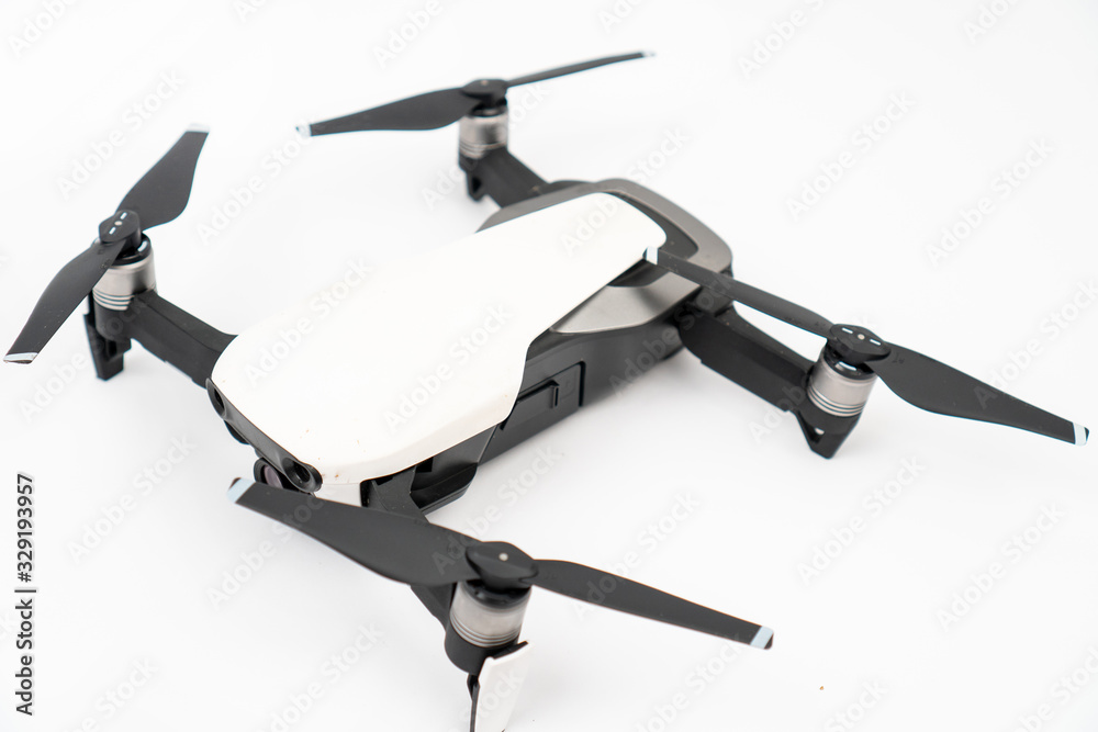 White drone quadcopter isolated above white background