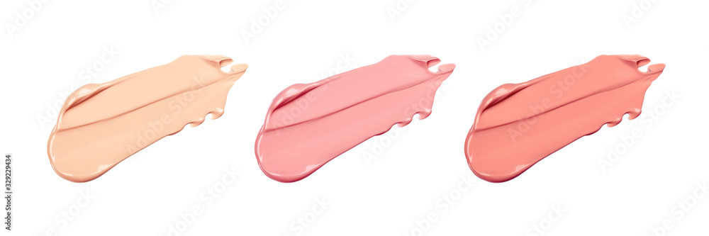 Delicate Light beige smears of tonal foundation on white background. Pink smudge of tone. Different pastel shades of BB cream isolated. Cosmetic products for makeup and skin care. Banner Cosmetology.