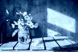 Beautiful bouquets of wildflowers on a wooden table on a cold concrete wall background.