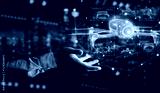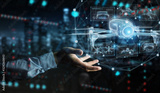Businessman holding and touching holographic drone projection in his fingers 3D rendering