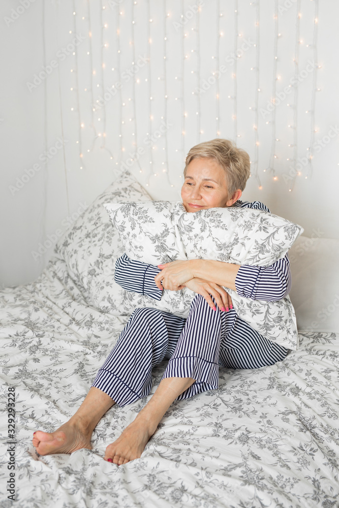adult elderly woman in pajamas in bed in the bedroom with a pillow