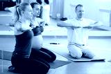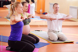 Beautiful pregnant woman performs aerobic exercises or asanas with a group of yoga in the fitness center