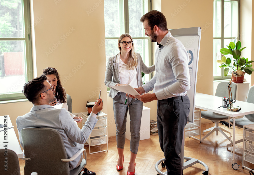 Group of young business people working together in office, two coworker conducting a business presentation using flip chart.