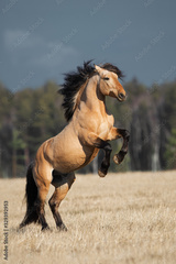 Beautiful buckskin rearing horse with long mane on natural summer background