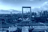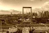 Aerial view of Dubai Frame, Downtown skyline, United Arab Emirates or UAE. Financial district and business area in smart urban city. Skyscraper and high-rise buildings at sunset.