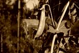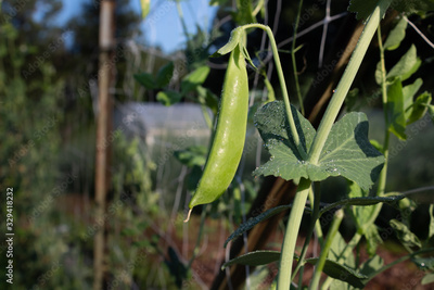 Growing single pea pod and vine, early morning dew, horizontal aspect