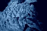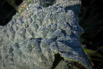 Heavily savoyed kale leaf covered in dew with rainbow light refraction of early morning sun, organic farming background, horizontal aspect