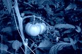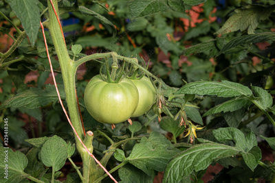 Pair of green tomatoes growing in a greenhouse, orange twine, organic farming, horizontal aspect