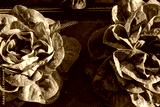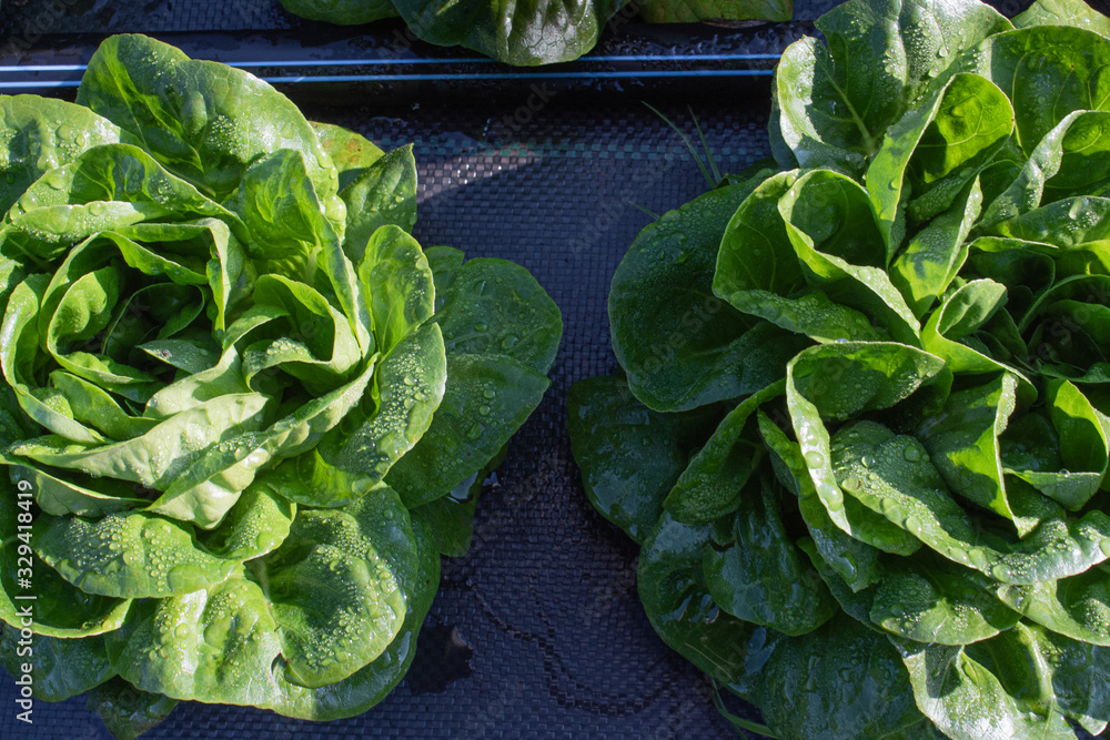 Space between two heads of lettuce in early morning sun, organic farming gardening, horizontal aspect