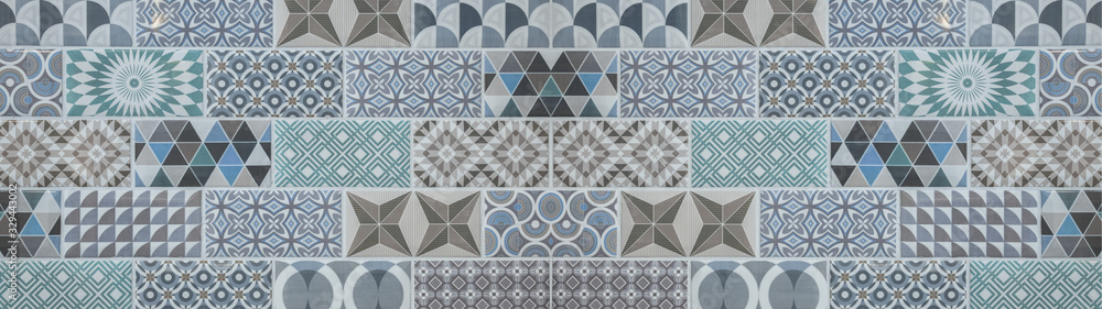 Blue white vintage retro geometric square flower motif tiles texture background banner panorama