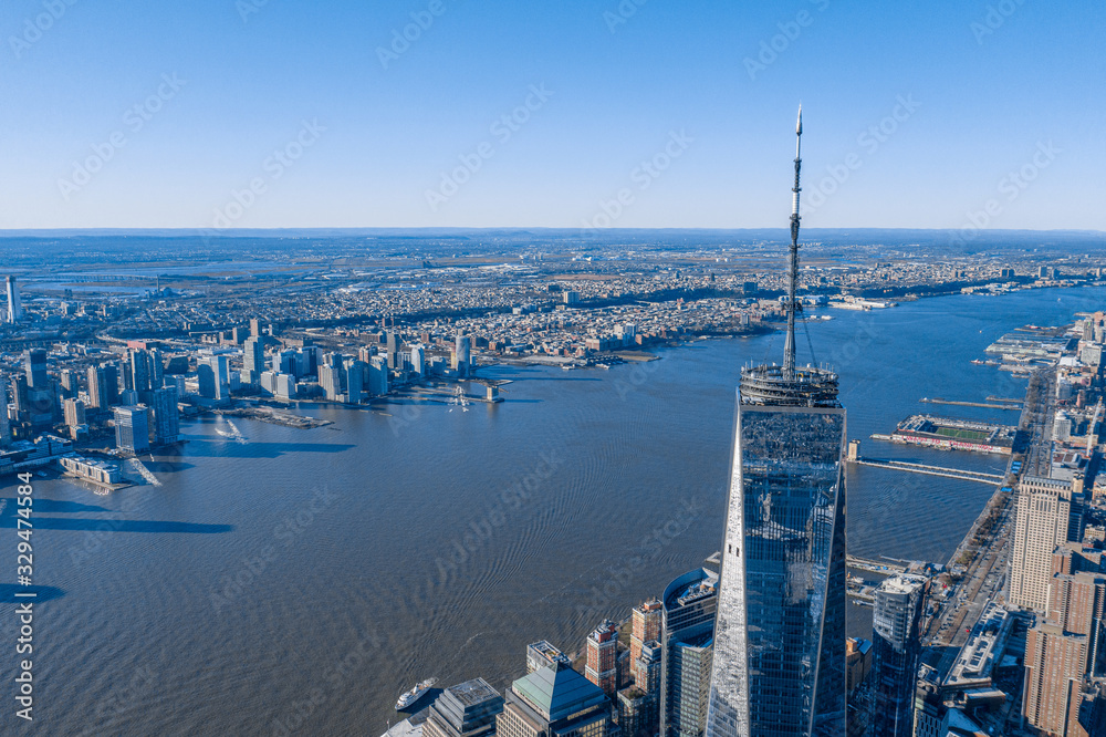 Aerial view of New York city and one world trade center brookfield place at day time