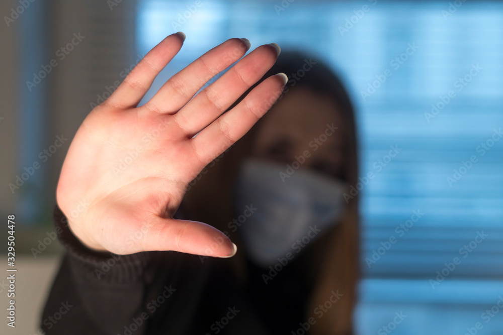 Prevent the spread of the Coronavirus Disease 2019 (COVID-19). Stop gesturing woman wearing a protective medical face mask. Selective focus