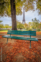 Green bench in Autumn with the Eiffel Tower in the background in Paris France