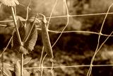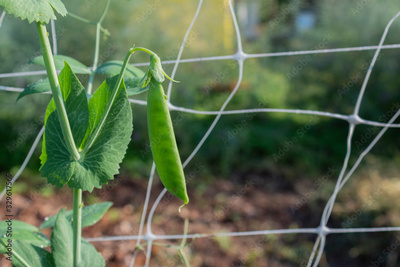 Close view of a single pea pod growing against a net fence, bugs, organic farming techniques, horizontal aspect