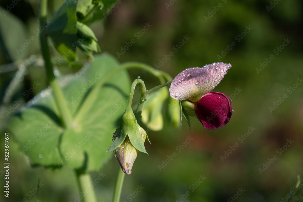 Pea blossoms covered in dew, selective focus, small community garden, organic farming, horizontal aspect