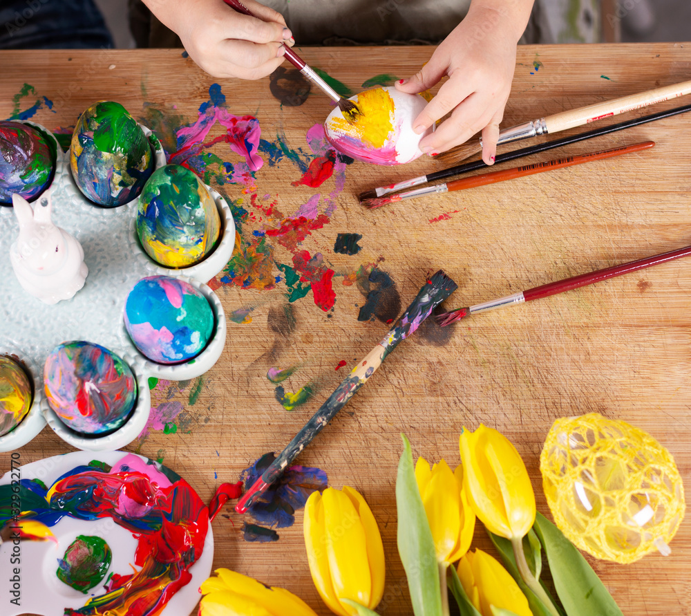 Hands of little girl with brush and colorful paint during decorate easter eggs on a wooden table. Top view.. Square.