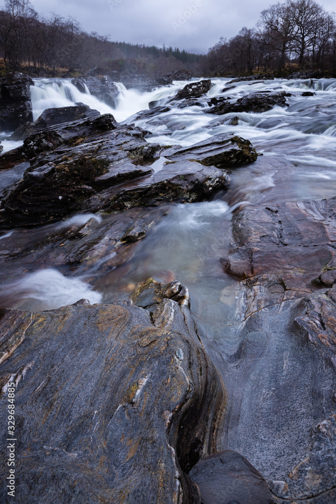 the waterfalls in Glen Orchy near Bridge of Orchy in the Argyll region of the highlands of Scotland during winter whilst the river is flowing fast from rainfall