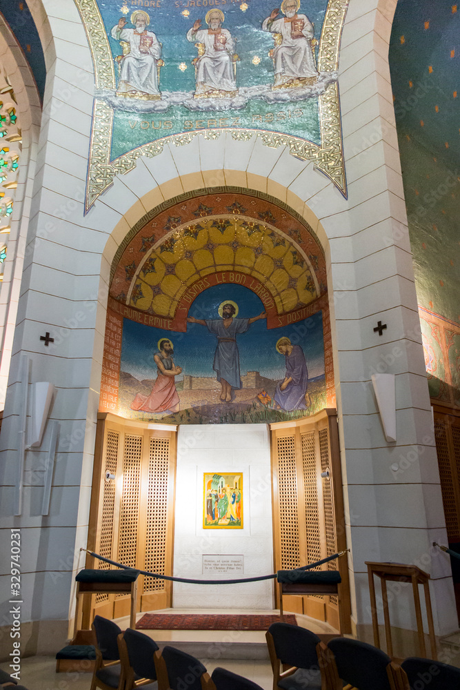 Jerusalem, Israel - January 30, 2020: Church of Saint Peter in Gallicantu is a Roman Catholic church on the eastern slope of Mount Zion. Israel. Colorful mosaics