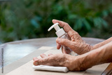 Elderly woman applying alcohol gel cleaning hands to helping protect from coronavirus covid-19
