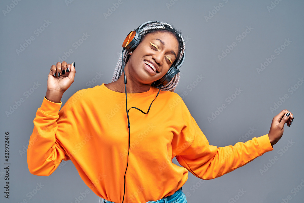 Afro woman in headphones listening to music and dancing over grey studio background